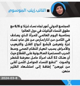 أخبار, نسوةّبرلمانية عراقية تستذكر الغزاويات: 52 ألف حامل معرضة للموت مدير التحريرمارس 8, 2024 شارك الخبرقالت عضوة البرلمان العراقي زينب الموسوي بمناسبة يوم المرأة العالمي إن” هناك أكثر من 52 الف امرأة حامل تتعرض للموت في غــ..ـزة. مشيرة في تغريدة عبر حسابها الرسمي بمنصة X: المجتمع الدولي “أعور و أصم” حسب قولها.