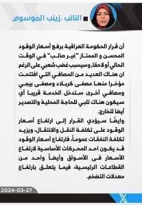 وقالت عضو اللجنة زينب جمعة الموسوي عبر منصة X : قرار الحكومة العراقية برفع أسعار الوقود المحسن و الممتاز غير صائب في الوقت الحالي أو لاحقا سيسبب غضب شعبي على الرغم ان هناك العديد من المصافي التي افتتحت مؤخرا منها مصفى كربلاء ومصفى بيجي ومصافي أخرى ستدخل الخدمة قريبا أي سيكون هناك تلبي للحاجة المحلية والتصدير أيضا للخارج”.